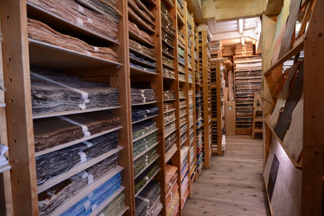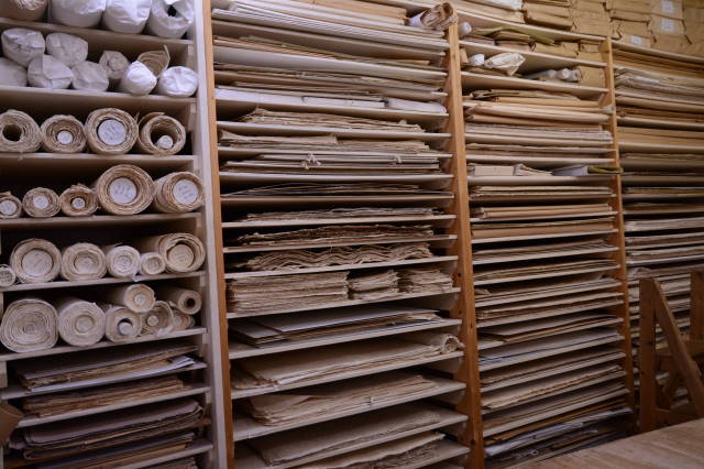 修復用の白い和紙と色ものの和紙の棚(画像提供:紙舗直)