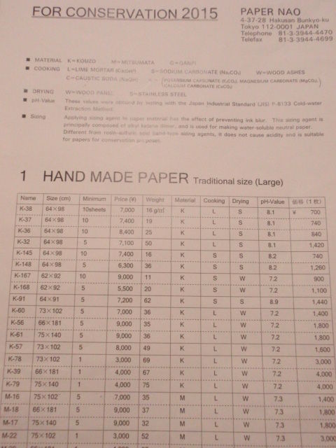 海外向け価格表この記事を書くにあたり、改めて銀花の記事を読み直した。その中で、高知県の四万十川沿いの村に芝さんという方をたずねるくだりがある。そこで漉かれていた十川泉貨紙を仕入れるにあたり「店の紙の基点となるべく、商品番号は楮の一番とした。」とあった。価格表を見ると、番号は通しになっておらず、欠番もある。また番号と紙の厚みは一致しない(小さい番号ほど紙が薄い、ということではない)。これは今販売できる和紙の仕入れ先を表しているということである。記事と価格表から見えたものは、坂本さんが和紙の生産地を訪ね歩き、作り手と対話を重ねてきた歴史であり、和紙に対する愛情である。その一方で、修復用和紙に必要なデータを(恐らく)主な買い手である修復関係者に提示したという、和紙の新しい売り方とその姿勢がある。