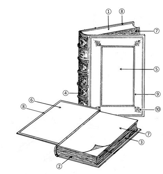 小口側の上下に亘るように革を貼る形の半革装(下図参照)。