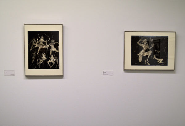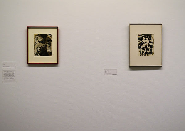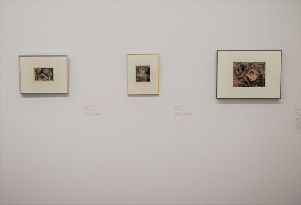 都城市立美術館_11右から《人魚の恋》(1954年、エッチング、[特])、《背中合わせ》(1952年、エッチング)《夢の精》(1952年、エッチング)。いずれも瑛九のサインやエディションナンバーはない。しかし、どれもインクの載りが良く、図像がはっきりと表れている。