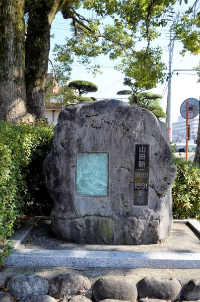 都城市立美術館_14美術館前には、山田新一の筆塚がある。緑青のふいたプレートには、頬杖をつく山田新一の像が刻まれている。