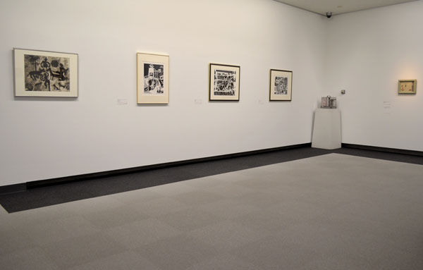 都城市立美術館_05こちらの壁面に展示されている作品4点は、左から《村》、《鼻高のプロフィール》、《Visiters to a Ballet Performance》、《家・窓・人》である。1979年「現代美術の父 瑛九」展(瑛九展実行委員会、小田急百貨店)の開催を記念して制作された細江英公のスタジオによるリプロダクション。下側にエンボスサインがある。原作は1950年から51年頃の作である。