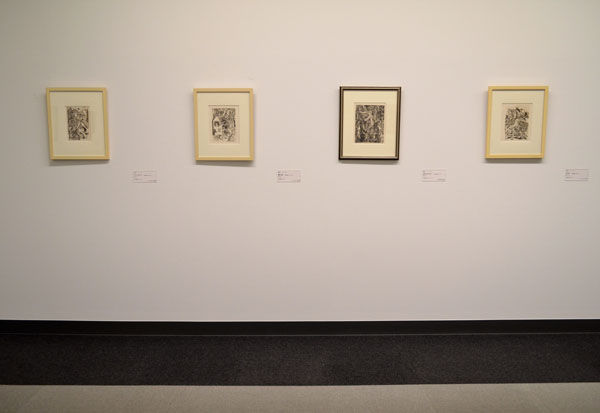 都城市立美術館_12右からSCALEⅠより《あくま》(紙・エッチング)、SCALE Ⅱより《夜のたたかい》(紙・エッチング、[特])、SCALE Ⅲより《愛の家》(紙・エッチング)、SCALE Ⅲより《ヴァイオリン》(紙・エッチング)。