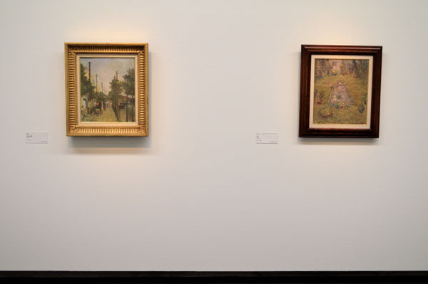都城市立美術館_07左から《並木通り》(1941年、キャンバス・油彩、45.5×38.0、左下「H.Sugita」サインあり、[特])。生誕100年記念瑛九展のレゾネでは、山田光春の記録に含まれていなかったものとして掲載されている(No.056)。《庭》(1942年、キャンバス・油彩、左下「H.sugita」の鉛筆サインあり、[特])瑛九の関係者によれば本作の描かれた場所は宮崎高等農林学校の敷地内に広がっていた風景であるという。レゾネのタイトルは、《庭にて》(No.071)