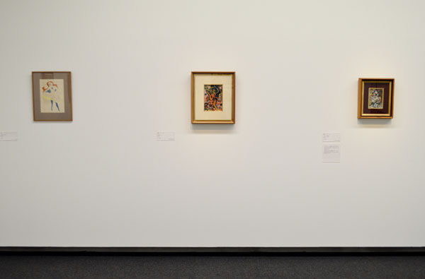 都城市立美術館_10向かって左から 《バレリーナ》(1950年、紙・水彩、28.0×20.0、左下「Q」のサインあり)、《バレー》(1950年、ガラス・油彩、22.7×15.8、[特])、《バレーの女》(1950年、ガラス・油彩、17.0×12.0)小品でありながらも、多彩な色面構成とスピード感のある筆跡が印象深い。ガラスの支持体を用いることで、バレリーナの繊細かつ華やかなイメージがより一層ひきたっている。この頃、バレーをモチーフにした作品をしきりに描いている。
