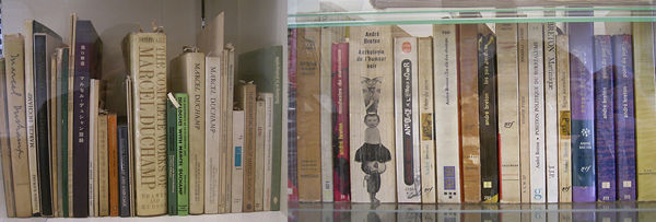 写真<15>多摩美術大学所蔵の瀧口修造の蔵書の一部。筆者の書斎にあるシュルレアリスム関係の同じ本を多く見つけた。