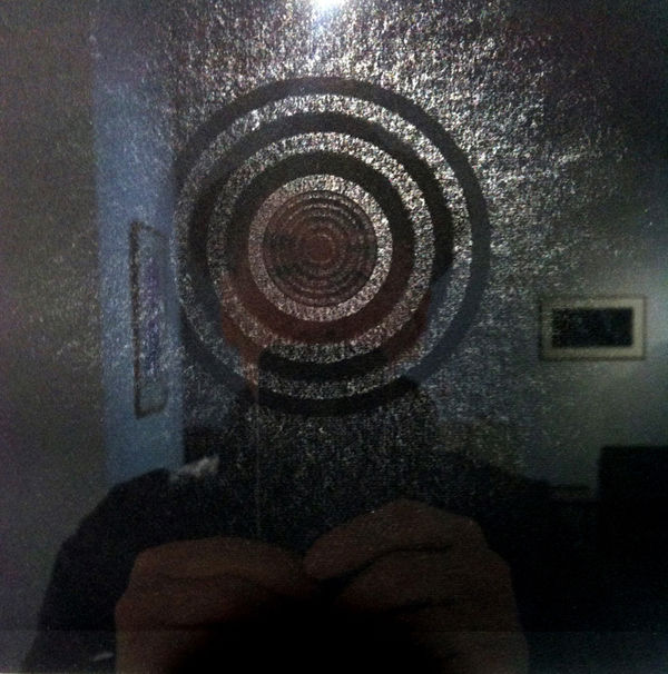 瀧口修造のロトデッサン(マルセル・デュシャン生誕130年記念『瀧口修造・岡崎和郎二人展』2017年2月8日まで 京都・ART OFFICE OZASAギャラリー)より。暗黒の太陽のようなロトデッサンが、額のガラス面に反射した筆者の顔に能面のように貼りついた。