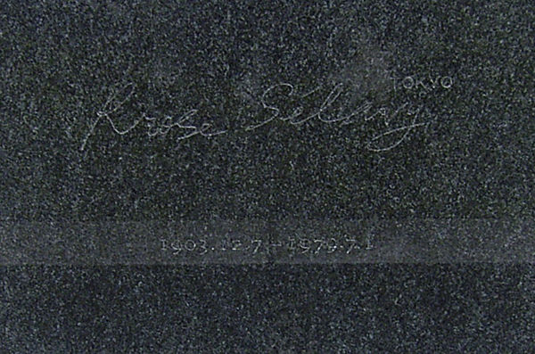 写真<19>2004年春、富山にある瀧口修造のお墓参りをした。お墓の裏側に、瀧口修造が夢見た幻のオブジェの店の名前「Rrose Selavy」(ローズ・セラヴィ)の文字が刻まれている。デュシャンが「オブジェの店」の看板にと命名を許しサインした。