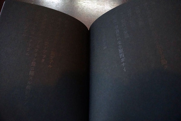 写真<14>『地球創造説』。黒の紙に黒のインクで詩を印刷している。「両極アル蝉ハアフロデイテノ縮レ髪ノ上デ音ヲ出ス…」(瀧口修造)