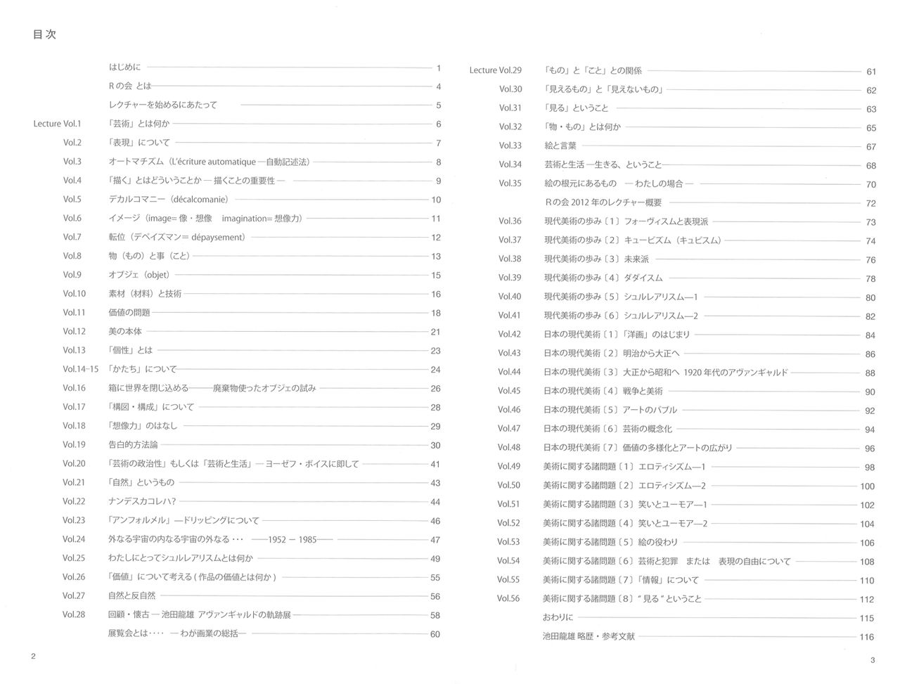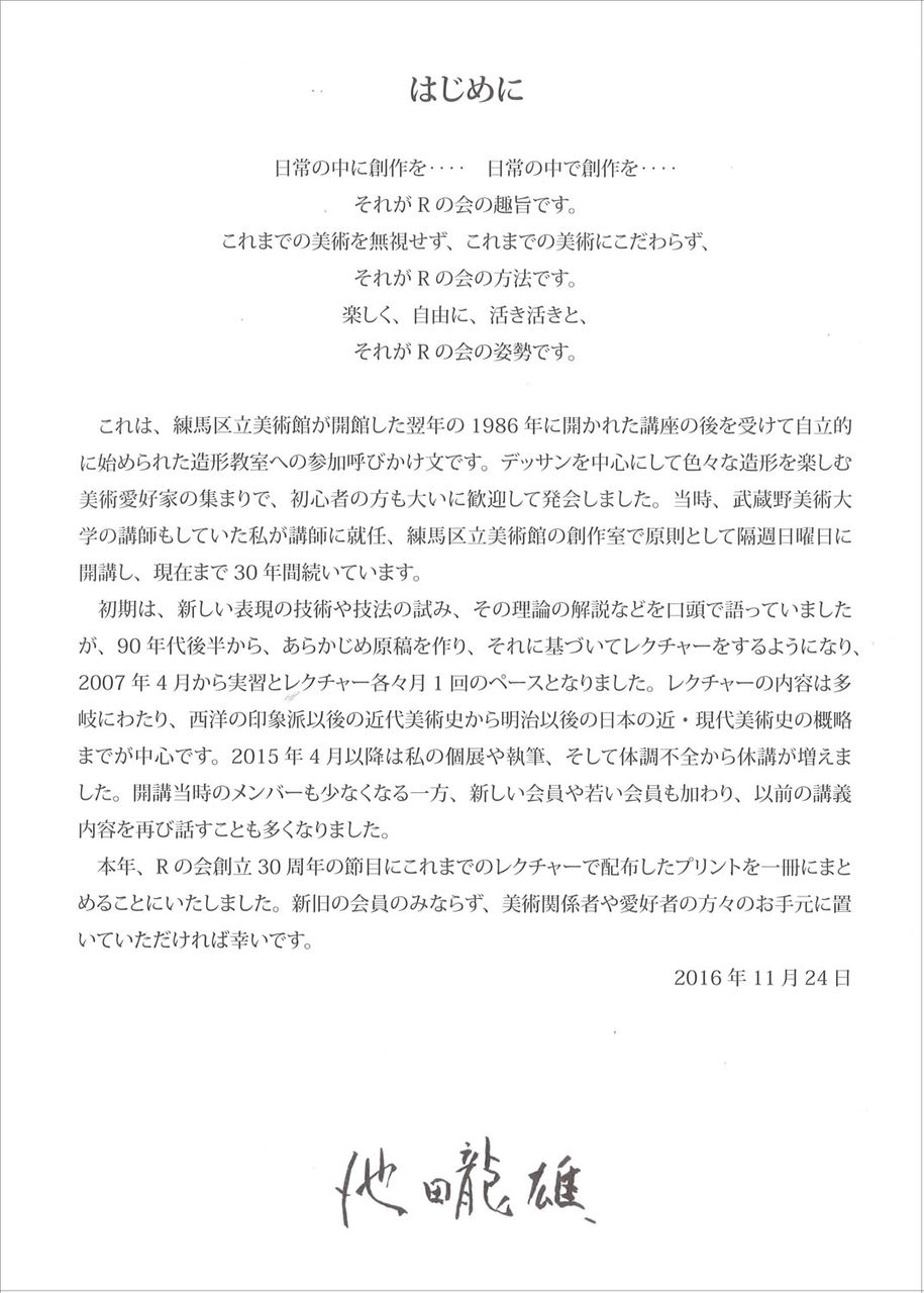 2013年夏、日曜の昼下がりに練馬区立美術館で開催中の『モダン・パリの装い』展を堪能、その帰りがけ、出入口脇にある区民ギャラリーの絵画展の様子が見えた。とたん、池田龍雄先生の勉強会が確か日曜にここで・・・と思い出し、受付に寄った。折よく奥の創作室で開催中とのこと、そっとドアを開くと先生を囲み10人ほどが集って、和気あいあい、優しい笑顔で迎えられた。それが<Rの会>との出会いだった。以来、美術展開催ごとに見学させていただいているうちに、会員の方からこれまでのレクチャーのプリントを渡された。タテ組ヨコ組あり、紙のサイズもフォントもバラバラだったが、60年代に芸大受験を目指し『別冊アトリエ』や『美術手帖』などをむさぼり読んでいた頃や70年代大学の哲学科で美学美術史を学びつつ演劇や映画美術の道を歩み始めた頃を思い出しながら、次々に読み進めた。90年から大学等でデザイン実習や美術史の講義を担当、当時は格好のテキストが見つからず、自分でプリントを作成していた。あの頃このレクチャー集があったら! 文中に登場する画家や作家の方々が、仕事でご一緒した方や、私の友人のご親族だったり、そして記載されている書籍がかつて私の愛読書だったりでドキドキワ クワクしつつ読みふけった。そんな私と池田先生、そしてRの会の方々の熱い思いが、この冊子制作につながった。本業の合間の作業、編集のプロでもない私が右往左往しつつなんとか完成までこぎつけることができたのは多摩美術大学講師時代の同僚でとことんお世話になった石黒教子さん、そして、いつも温かく見守ってくださった池田紀子さんと哲さんの応援あってこそ! この場を借りて心より御礼申し上げます。