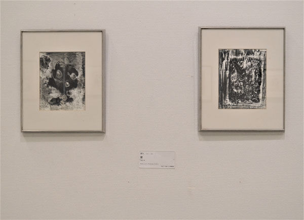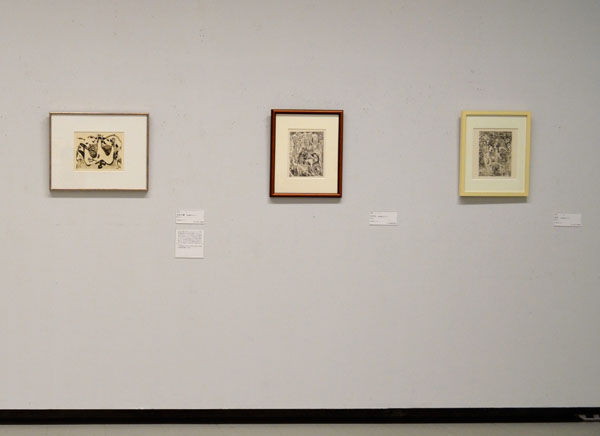 向かって右側の壁には、林グラフィックプレスが発行した銅版画の後刷り画集「SCALE」のシーリーズが展示されている。手前からSCALEⅡより《いかり》(1957年、紙・エッチング)、SCALEⅢより《風と少女》(1957年、紙・エッチング)、SCALEⅢより《星》(1956年、紙・エッチング、ドライポイント、ルーレット)、SCALEⅡより《たたかい》(1956年、紙・エッチング)、SCALEⅤより《森の精》(1958年、紙・エッチング、館蔵品)、SCALEⅤより《雲の花》(1958年、紙・エッチング、館蔵品)