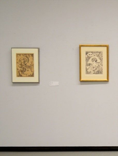 階段を2階に上がると、《神話》(1956年、紙・エッチング、右下に鉛筆で「Q Ei」のサインあり、[特])が目に付くところに展示されている。会場を見渡すと瑛九の版画が整然と並んでいる。広々とした会場をも埋め尽くす作品点数の多さは、まさに圧巻である。