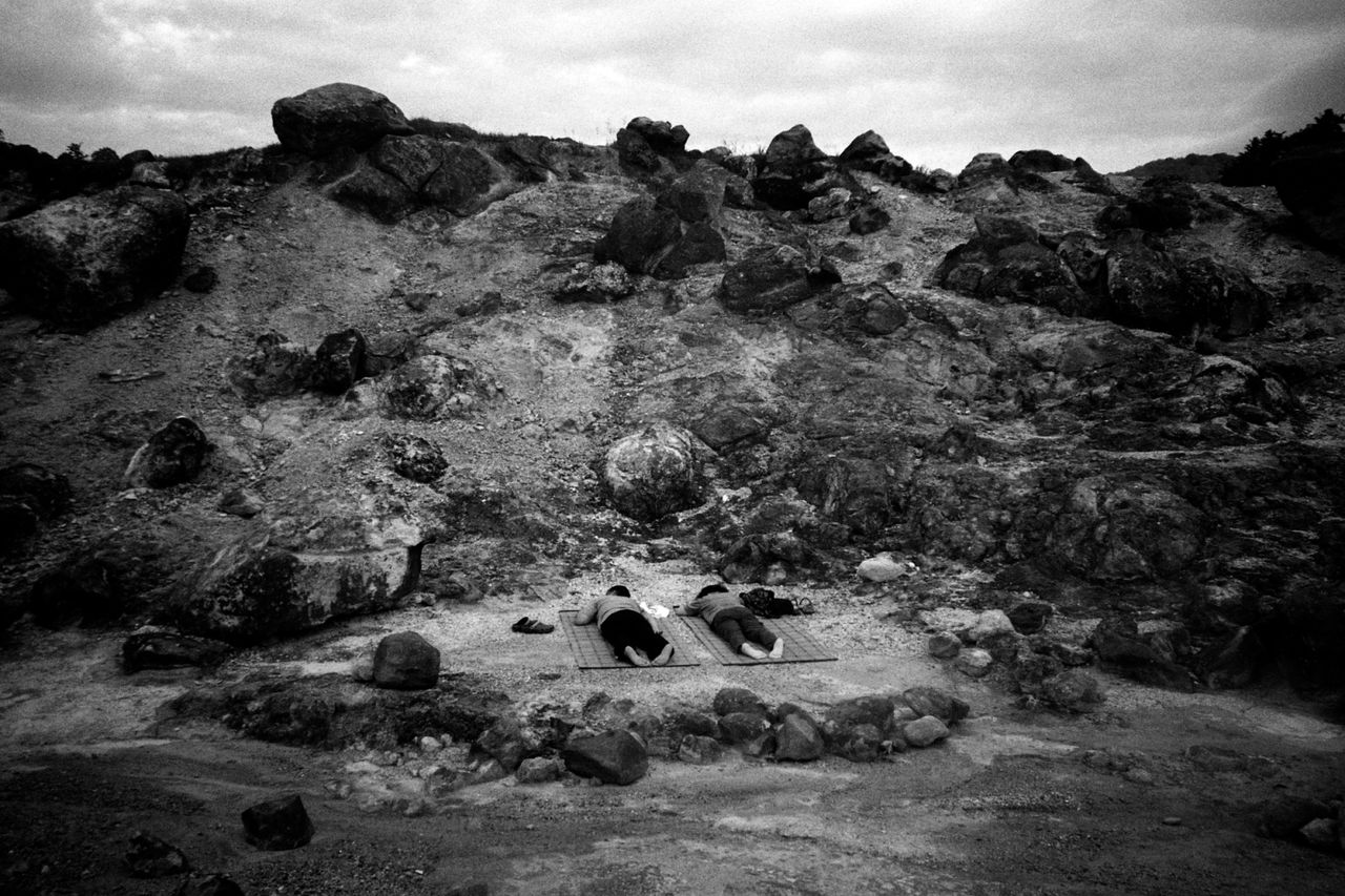 この場所の核心は、実はその岩にあるのではないか。ふたりの人間はただそこに寝転がっているのではなく、その岩が発するパワーをあがめて五体投地しているのではないか。