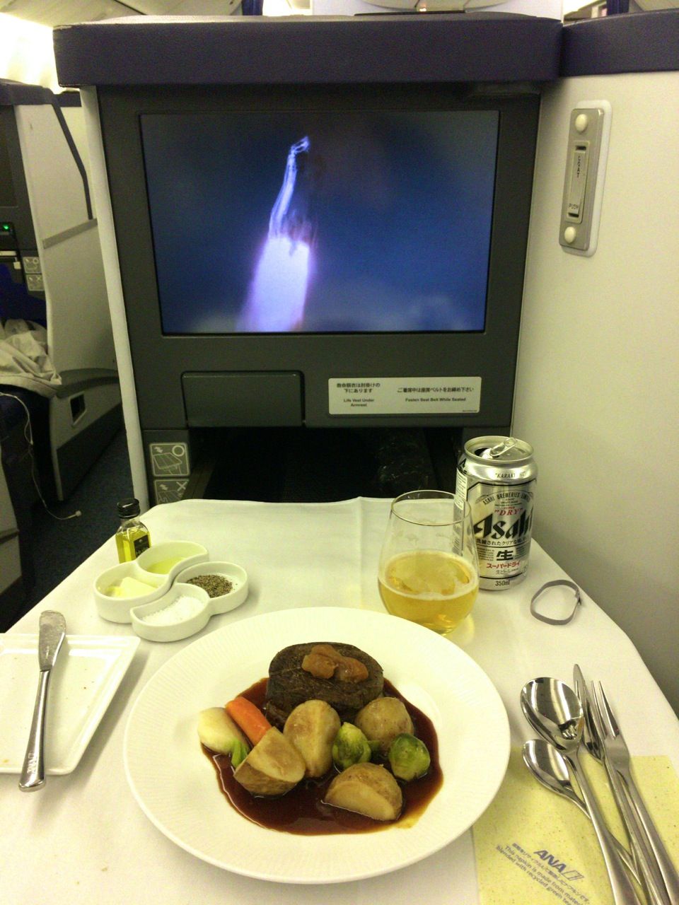座席が広く、リクライニングは水平までできて食事は豪華!ちょうど腰痛がキツくなっていたので、なんとも快適な空の旅でした。