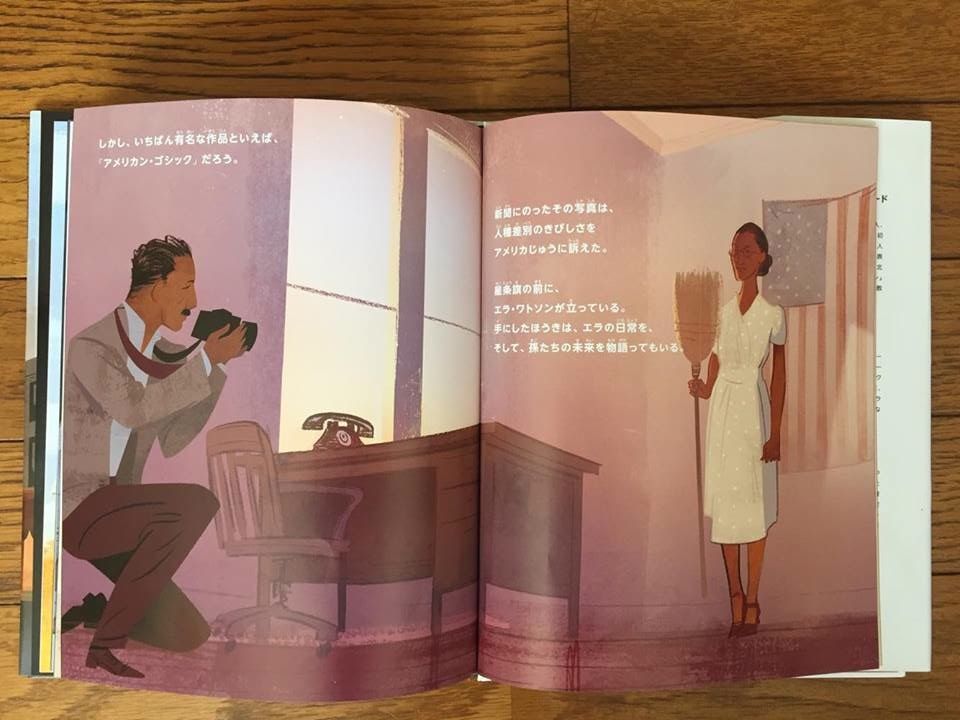 (「アメリカン・ゴシック」を撮影する場面)「しかし、いちばん有名な作品といえば、「アメリカン・ゴシック」だろう。新聞にのったその写真は、人種差別のきびしさをアメリカじゅうに訴えた。 星条旗の前に、エラ・ワトソンが立っている。手にしたほうきは、エラの日常を、そして、孫たちの未来を物語ってもいる。」