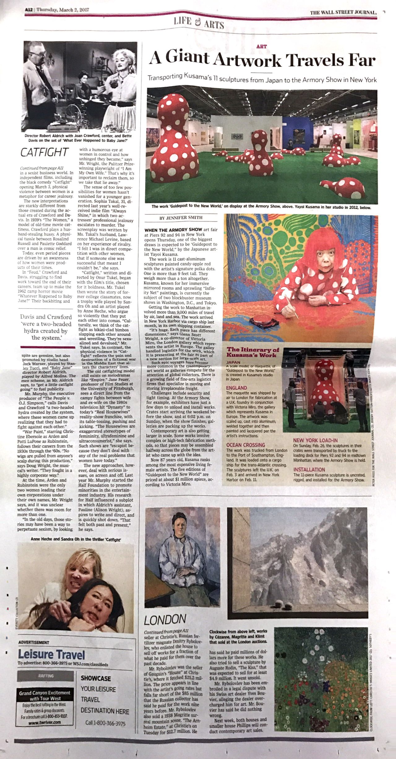 最後にご紹介するのはウォールストリートジャーナルに掲載されたart on paperの広告と、アーモリーショーに出展された草間彌生のインスタレーションの紹介記事です。