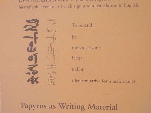 パピルスコーナーにあったヒエログリフの説明書き。今までヒエログリフはどうしてあんなイラスト然としているのに言語として成り立つのか不思議でしたが、なるほどここまで崩せばハングル語辺りとそう変わらないなと納得。