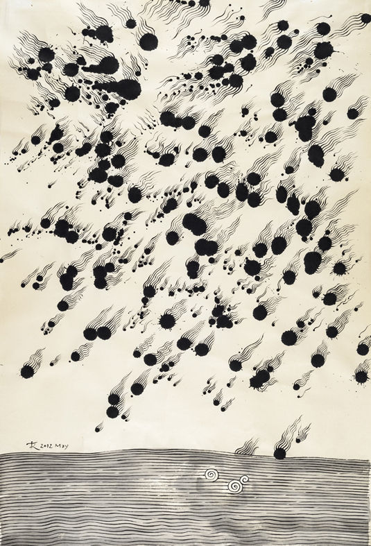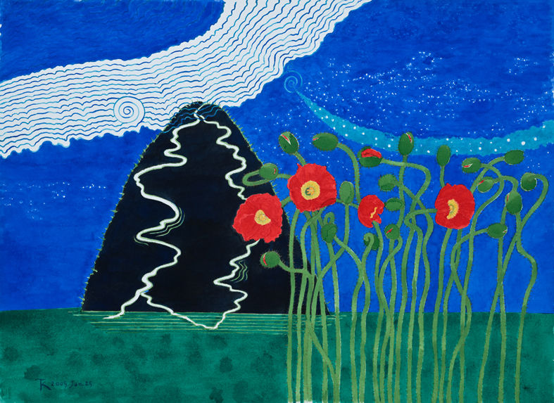 10年ほど前、100枚の絵を描こうと思い立ち、仕事場の机の前に「百枚の絵」と書いて貼っておいた。それを見られたのか、偶然なのか「ときの忘れもの」の綿貫さんから机からはみ出すほどの大判を含めて、分厚い水彩紙が10枚ほど送られてきた。「やってみたら」という叱咤である。以前、大判はクレヨンで描いていたのだが、まずその大判を水彩で描きつぶしてみた、が水彩になじめない。以来、油彩に浮気をし、墨を試し、そして水彩と油彩を併用するという具合に脈絡も無く、定まるところなく描いてきた。