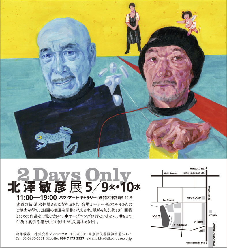 ここ2年は指と気力が動かず、目標の100枚にも届かず、頓挫していたところ、先月末に武道の師・清水伯鳳さんに、会場を押さえたから個展をやらないかと背をおされ、会場オーナー・松本ルキさんのご協力を得て、2日間の個展を開くことになった。今回は、約10年間に描きためた56点を展示予定。10年で割るとたいしたことの無い点数です。