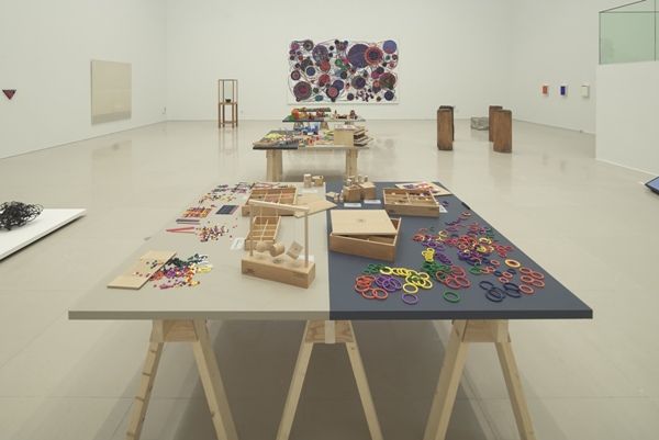そもそも、展示の始まりが教育遊具だなどと想像して見に来る人などいないのではないだろうか。早くも日本で明治時代に導入されたフレーベルの恩物や、その後展開したモンテッソーリ、シュタイナーの玩具は、それらに直接触れることを通して、私たちにモノそのものの本質を垣間見せ、また私たちをしかるべき行動に導いてくれるものとして考案されたという。そして、そうした幼児期の原初の具体的体験こそが、作家たちの創造の根底にあり、抽象芸術の本質に繋がることを、会場の真ん中に置かれたテーブルの上の玩具と、それを取り囲む現代美術の作品たちとの関係―積み木の傍に置かれたリュックリームの石組みのドローイング、熱で形態変化する蜜蝋粘土の傍に置かれた脂肪の詰まったボイスのジョッキー帽、カラフルなフレーベルの恩物の球に向かい合う田中敦子の円と電気コードの描写から成る絵画―が浮かびあがらせてくれる。通常の美術展では、玩具といっても、名前のある作家のものであるか、あるいは、あくまでも文化史としてしか紹介できないところを、入念な調査を経たうえで、確信をもって、ヒエラルキーを覆して、抽象芸術の始まりとして鮮やかに披露する。