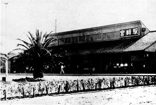 戦時中に空襲で焼失した後に建てられた宮崎駅の駅舎。昭和30年代に撮影されたもので、この頃にも丸々と成長した特徴的なフェニックスがある。a.一ッ葉浜(pp.50-51、p.207他)