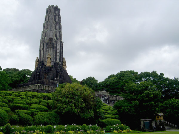 話が横道にそれてしまうが、この場面について気にかかってならなかったのは、このとき日名子実三《平和の塔(八紘之基柱)》が既にあったのか、無かったのか、である。公に出ている年号からたどれば、本作は紀元二千六百年記念の事業の一環として1939(昭和14)年5月に着工され、1940(昭和15)年11月には完成している。公園の近所にある宮崎神宮が神武天皇を祀っていることから記念事業が行われるのは、当然と言えば当然で、瑛九らが観に行った当時(1938年1月)は、着工の一年前で既に計画が発表されていたことが予想される。本書には一切この彫刻に触れていないが、瑛九はこの計画を既に知っていた可能性が高い。というのは、次のページには「その翌朝、油絵作品のすべてが片づけられた瑛九の部屋の壁に、『日の丸の 旗はためく 日本の風景』と毛筆で書かれた半紙の貼られていたのを見た」とあるからだ。瑛九は《平和の塔》が建立されることを知っており、ただ宮崎平野の風景に感激したわけではなく、変わりつつある未来の風景を見据えて涙を流していたのだろう。このような鋭敏な感覚の持主であったからこそ、瑛九は表現者として成功することになった。