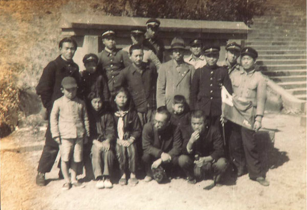 エスペラント部の生徒と写る瑛九。1950年頃か。《平和の塔》に続く階段横で撮影されたことが分かる。