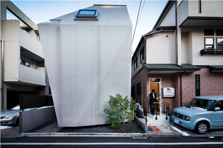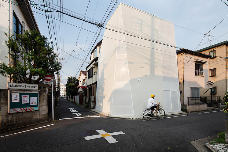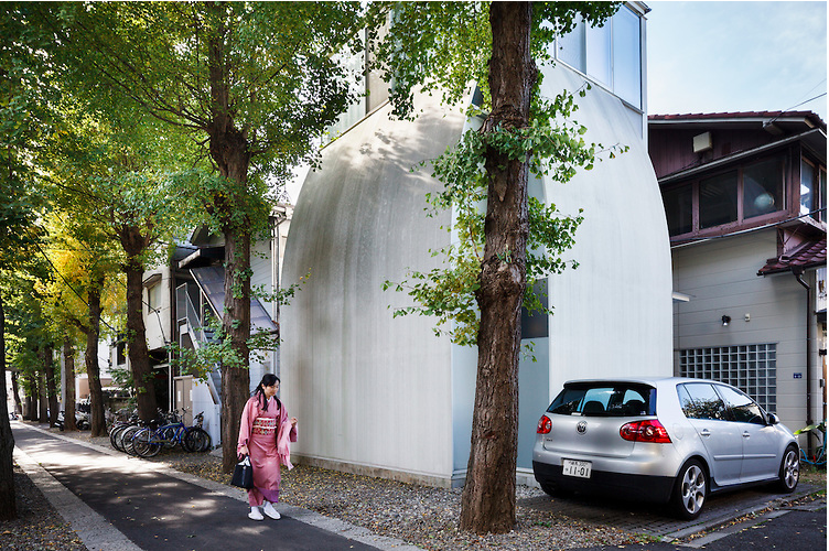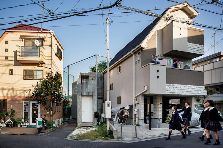 ステラが捉えた住宅の多くは、都心の限られた敷地に建てられたいわゆる狭小住宅と呼ばれるもので、ユニークな造形の住宅とともに、建てられた敷地のあり方にも眼が惹きつけられます。たとえば、いびつな形をした区画の端や角のわずかな空間や、建物と建物の間の間口が3mにも満たないような細長い形状の土地のように、町の土地区画から取り残された敷地の中に、建築家がアイデアと工夫を凝らして作り上げた住宅が納まり、側に停められた自動車や自転車、通行人が、家のスケールを測る尺度のようにも映ります。「Laatikko」(図4)は、隣接する建て売り住宅の方が画面の中に大きく捉えられ、わずかに戸口と側面だけが写っており、画面を右側から通りかかる女子学生たちの姿と相まって、主役であるはずの住宅が、さほど目立つこともなく、周囲の景色に馴染んでひっそりと存在するものとして捉えられています。House Tokyo(図3)が、素材や形において、周囲の住宅とは全く異質な強い存在感を持つものとして、その特徴が際立つような視点から捉えられているのと比べると、「Laatikko」(図4)は、敷地の形や隣接する建物との位置関係によって、景色の中に紛れ込んでしまっているようです。どんなに奇抜なデザインの住宅も、町の景色の中に飲み込まれている様子は、新陳代謝を繰り返す東京という都市が持つ性格をあらわにしているようでもあります。