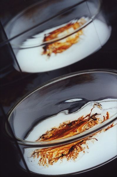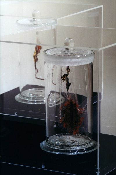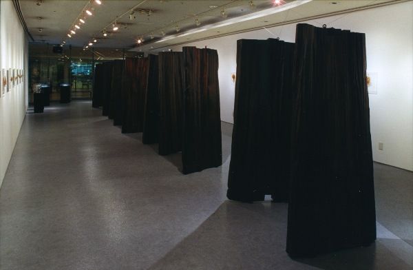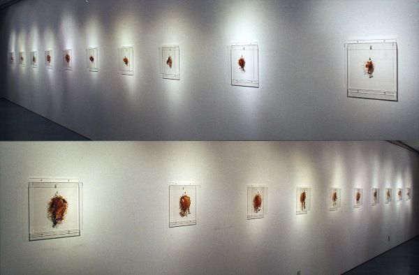 「黙森」と題した展覧会は2000年の掉尾(11.18~12.16)で、角さんはちょうど60歳だった。大へぎ板を立てるため固定用金物を特注し、ラップはガラス容器やこれも特注のアクリルボックスを用意して、生物標本か宝石のように展示した。会場の中央に大木が林立するようにへぎ板を配置し、周囲をその雫のようなラップで囲んだ。対照的な2種類のオブジェによるインスタレーションだが、主役はもちろん〈漆〉だった。