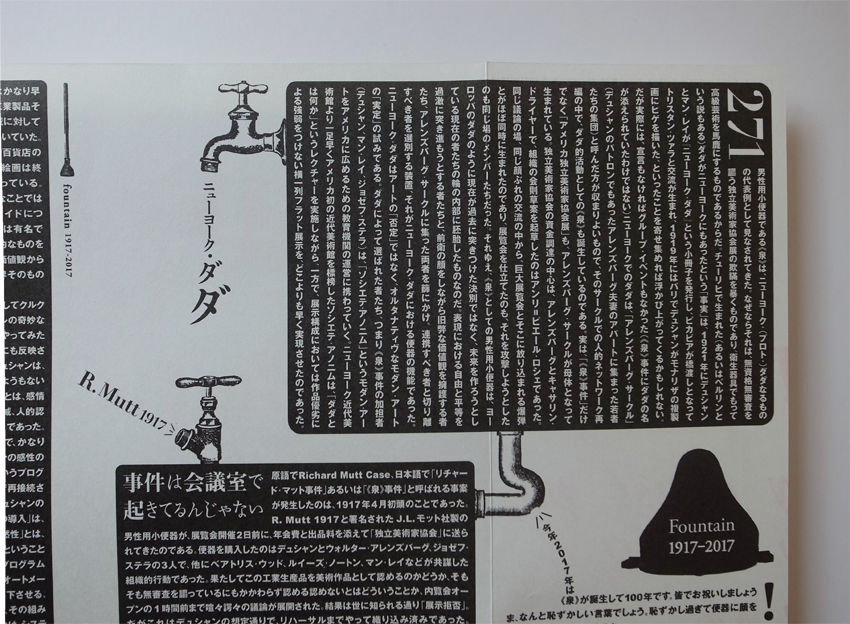 三次元が現代科学では計測不能な空間の影であるとしたら、怨霊が渦巻く京都盆地に『泉』がぽんと置かれているのは意味がある。水脈がどこを通っているのか知っているやんごとなきお方も岡崎の地には多いだろうから、含まれる鉱物をすくって飲みたい誘惑に抗えない。用意された8個の貯水槽からキラキラ光る言葉の流れが水管を伝って『泉』から湧き出ている。平芳幸浩氏がチラシに寄せたテキストは10,000字を超え、ダダイストたちが喜びそうな紙面構成で貯水槽と蛇口が繋がれ、それぞれに大きく「Living in the Material World」「271」「事件は会議室で起きてるんじゃない」「変身」「ガラスの仮面」「箱男」「蜘蛛の糸」「トモダチコレクション」と書かれている。遊び心満載で筆者の楽しみが直接伝わる感覚。チラシの「もの」としての魅力も含め、コレクター・アイテムとなること間違いなし。ところで「291」なら雑誌も展示されていたし、スティーグリッツとの関連で判るのだけど、「271」って何んなのよ。