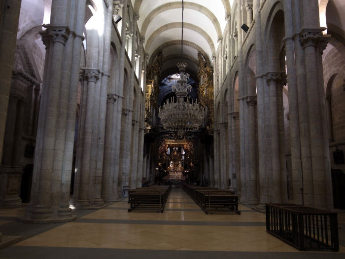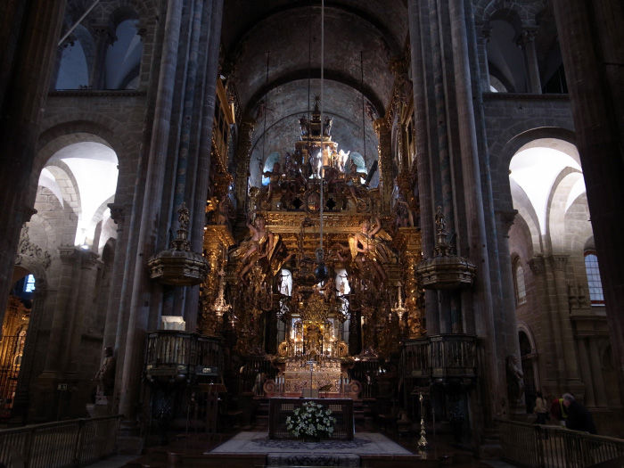 中に入り、身廊を進むと「ガリシアバロック」とも呼ばれるチュゲリア様式で豪華絢爛に飾られた主祭壇。ここには正面に「使徒姿の聖ヤコブ」その上に「巡礼姿の聖ヤコブ」さらにその上、天使たちの運ぶ金の絨毯の上に「戦士姿の聖ヤコブ」の姿を見ることができる。それは聖ヤコブ信仰の発展の姿を示すものではあるだろうが、巡礼の意味が大きく変化し、聖遺物のご利益を求めての旅から、巡礼という行為そのものを通して、象徴的に「死と再生」を求める求道の旅の側面を強くした現代のサンチャゴ・デ・コンポステーラ巡礼においては、この大祭壇も地下のヤコブと弟子たちの墓もかつてのような威光を発揮することはできていないような気がする。