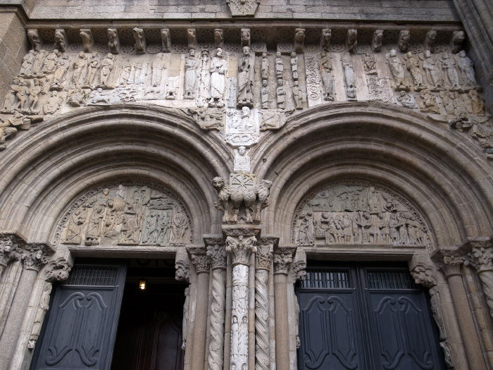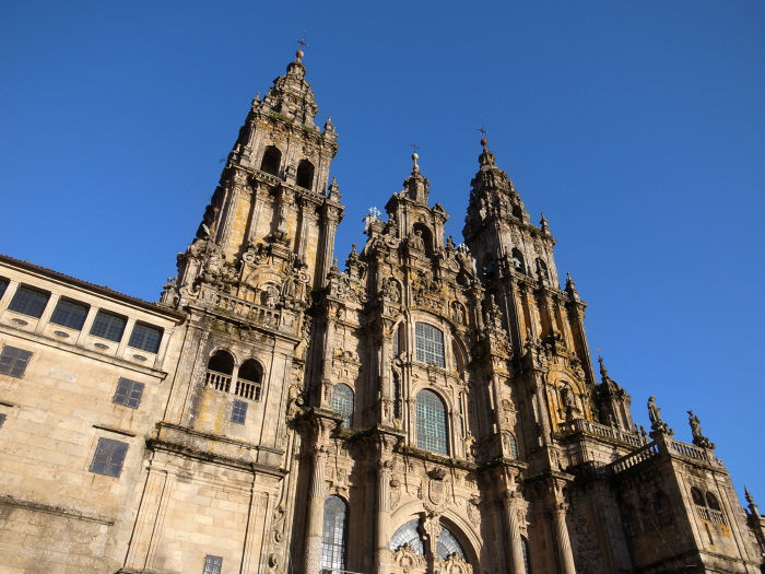 現在のサンティアゴ・デ・コンポステーラ大聖堂のメインビジュアルである西正面ファサードは、フェルナンド・カサス・イ・ノーボアによるバロック様式のものであるが、中世から巡礼者を迎えてきた「栄光の門」は12世紀の彫刻家マテオが20年をかけて彫りあげたロマネスク彫刻の傑作である。