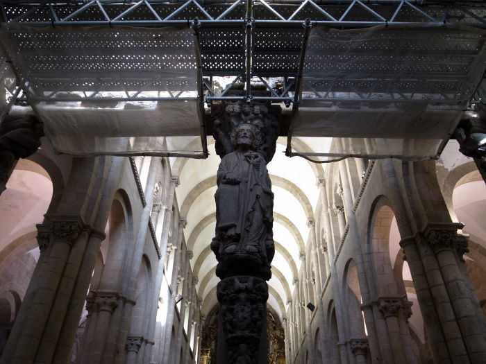 内部現在のサンティアゴ・デ・コンポステーラ大聖堂のメインビジュアルである西正面ファサードは、フェルナンド・カサス・イ・ノーボアによるバロック様式のものであるが、中世から巡礼者を迎えてきた「栄光の門」は12世紀の彫刻家マテオが20年をかけて彫りあげたロマネスク彫刻の傑作である。