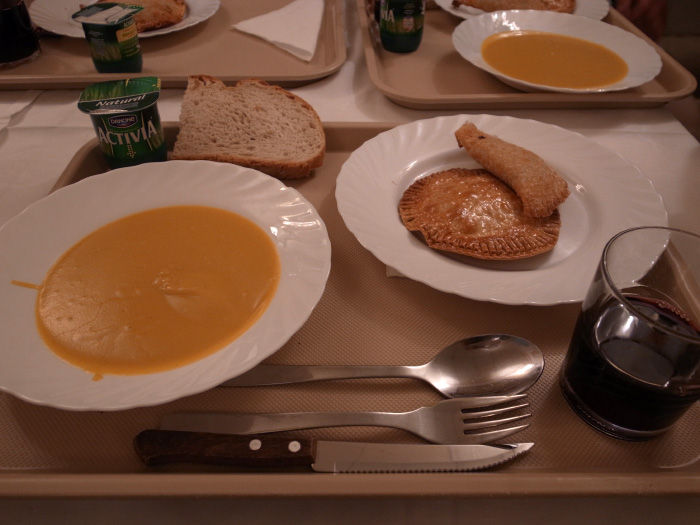 夕食はパラドールでの巡礼者のための賄いメニュー。先着10名の特別なもの。質素であるが、自分が巡礼者であることを実感できる。素晴らしい建築、空間。歴史がこれをつくったのだ。