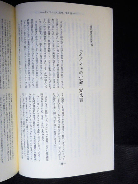 瀧口は1962年に出身地の富山市で開催された第15回全国造形教育大会において「今日の美術―オブジェを中心として」と題した講演を行っているが、その下書きにあたる未発表原稿が「オブジェの生命」覚え書として遺されていた。(みすず357号1990年12月)その中で「シュルレアリスムがオブジェというものを普遍化させた最初の体系的な運動」であり、「日本に芸術用語としてのオブジェを流行させた最初の張本人は私であった。」と述べ、オブジェの分類の中でも「本質的で基本的なものはobjet naturel(自然の物体)殊にobjet trouvé(発見されたオブジェ)である。」と結論付けていた。
