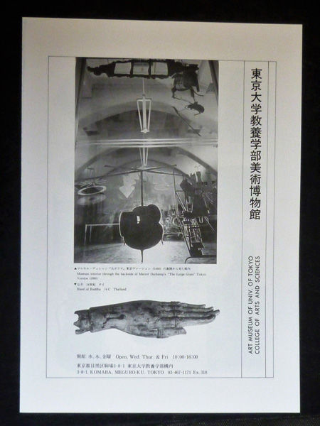 実川さんは初対面の私にも親切に応対してくださり、画廊を始めた経緯や日本ではあまり取り扱われていなかったド・スタールやポリアコフなどの展覧会を行ったこと、駒井哲郎の版画がまだ売れない時期に1枚1万円で仕入れていたことなどを話された。そして、瀧口先生はまるで仙人のような生活を送っていたと語り、あの書斎をそのまま遺せなかったことを惜しまれた。また、デュシャンの「大ガラス」東京版が国有財産として東京大学教養学部美術博物館に東洋美術の考古物と一緒に陳列されていることが面白いと言い、見に行くことを勧められ、その場で「大ガラス」の制作に携わった東大の横山正助教授の助手の方に電話して見学の了解まで取り付けていただいた。翌日、駒場にある美術博物館へ行き「大ガラス」と初めて対面することができた。世界で三つしかない「大ガラス」のレプリカの一つが、この日本にあること自体特筆すべきだが、デュシャン夫人は瀧口修造と東野芳明による監修を条件に制作を許可したそうである。しかし、その完成を見ずに瀧口は逝ってしまったのも「ガラスの遅延」(「急速な鎮魂曲」美術手帖1968年12月号)と言うべきだろうか。