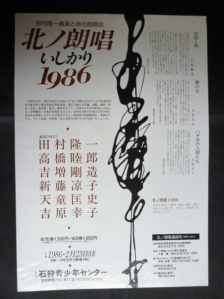 同上内容見本天童さんは1983年より吉増剛造さんらと共に北海道を回る「北ノ朗唱」を行っていたが、愛媛でも聲を発したいという希望に応えるため、私が仲介となり松山で出版を営む創風社の大早友章さんに主催を、後援を友人の江原哲治さんにお願いして1989年9月9日松山市のアオノホールにおいて詩人の白石かずこさんと天童さんを招き「詩の夜 SPIRIT VOICE」と題して四国初の朗唱のイベントが行われた。