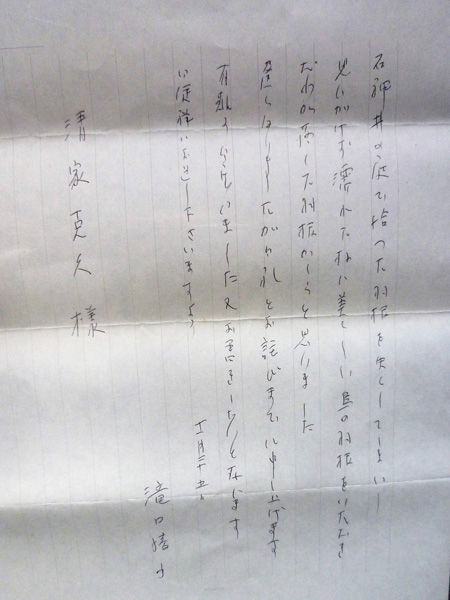 綾子夫人の手紙実川さんは初対面の私にも親切に応対してくださり、画廊を始めた経緯や日本ではあまり取り扱われていなかったド・スタールやポリアコフなどの展覧会を行ったこと、駒井哲郎の版画がまだ売れない時期に1枚1万円で仕入れていたことなどを話された。そして、瀧口先生はまるで仙人のような生活を送っていたと語り、あの書斎をそのまま遺せなかったことを惜しまれた。また、デュシャンの「大ガラス」東京版が国有財産として東京大学教養学部美術博物館に東洋美術の考古物と一緒に陳列されていることが面白いと言い、見に行くことを勧められ、その場で「大ガラス」の制作に携わった東大の横山正助教授の助手の方に電話して見学の了解まで取り付けていただいた。翌日、駒場にある美術博物館へ行き「大ガラス」と初めて対面することができた。世界で三つしかない「大ガラス」のレプリカの一つが、この日本にあること自体特筆すべきだが、デュシャン夫人は瀧口修造と東野芳明による監修を条件に制作を許可したそうである。しかし、その完成を見ずに瀧口は逝ってしまったのも「ガラスの遅延」(「急速な鎮魂曲」美術手帖1968年12月号)と言うべきだろうか。