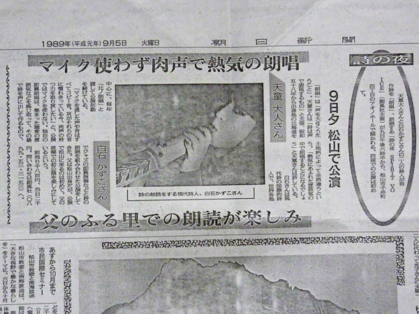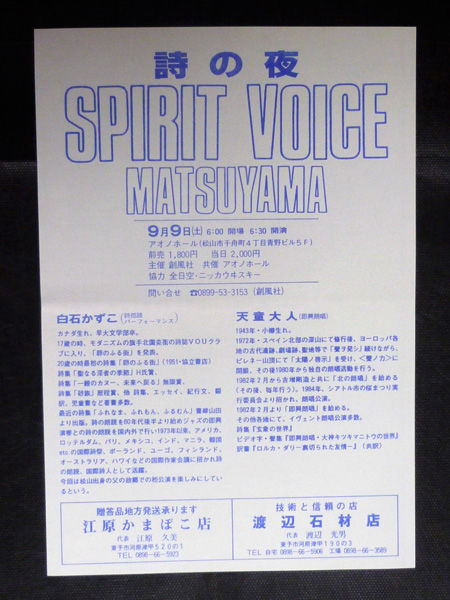 天童さんは1983年より吉増剛造さんらと共に北海道を回る「北ノ朗唱」を行っていたが、愛媛でも聲を発したいという希望に応えるため、私が仲介となり松山で出版を営む創風社の大早友章さんに主催を、後援を友人の江原哲治さんにお願いして1989年9月9日松山市のアオノホールにおいて詩人の白石かずこさんと天童さんを招き「詩の夜 SPIRIT VOICE」と題して四国初の朗唱のイベントが行われた。