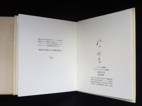 実川さんは瀧口の本を探すなら友人でそうした情報に詳しい人がいると言って紹介されたのが詩人で朗唱家の天童大人さんだった。天童さんからは瀧口の本が見つかるたびに電話や手紙で頻繁に連絡をいただいた。そのおかげで一気に収集が進み、その中には「超現実主義と絵画」「黄よ。おまえはなぜ」「星は人の指ほどの―」「畧説虐殺された詩人」「自由な手抄」など容易に見つけることができないものも含まれていた。
