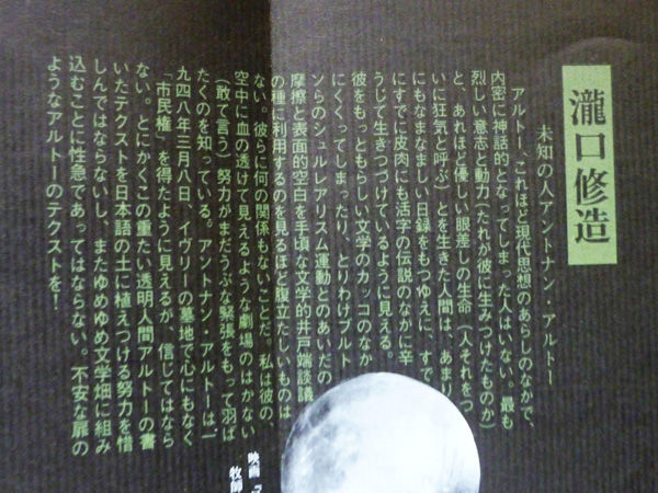 同上このことが機縁となって交流が始まり、ご自身の活動である詩の朗唱や美術展評に関する資料などを送っていただいた。私には朗唱という言葉は聞き慣れないものだったが、聲の持つ始原の力を現代に蘇らせる行為として朗読との違いを強調されていたように思う。天童さんが初めて即興朗唱を試みたのは瀧口の三回忌を目前にした1981年6月26日、東京・六本木のストライプハウス美術館でのイベントにおける「アントナン・アルトー ― 瀧口修造へ ―」と題する作品であったという。(巒気通信創刊号1985年発行)瀧口とアルトーといえば第1巻のみ刊行され絶版となった「アントナン・アルトー全集」(現代思潮社刊1971年)の瀧口にしては珍しくエキセントリックな装幀と内容見本に書かれた「未知の人アントナン・アルトー」を思い出す。