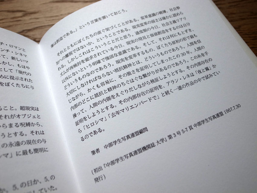 本書では、前述した故山本悍右先生のエッセイ2編を再録する事ができた。どちらも1967年に発行された中部学生写真連盟の機関誌に発表されたもので、高校生向けの「高校生写真のこと」には副題として「技術は君たちにとって何か?」とあり、これは二度目の再録、わたしは高校3年生の時に先輩(故杉山茂太氏)から頂いた「フォト・オピニオンNo.1」からガリ版切りで転記し、集会で使用したのだった(当時の様子については「山本悍右とフォト・オピニオン」と題して季刊『リア』14号で報告した)。もう1遍は大学生向けの「闇の中の二枚の証明書」で、友人(山崎正文氏)からコピーの提供を受けた。つたない、わたしの写真群だけでは、時代と状況が蘇らないと思うが、今日では容易に読むことの叶わないエッセイの中に含まれる「静かな抵抗」を取り出せたことが、わたしにとって喜びとなった。