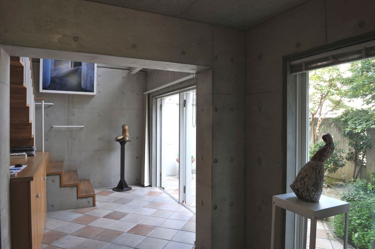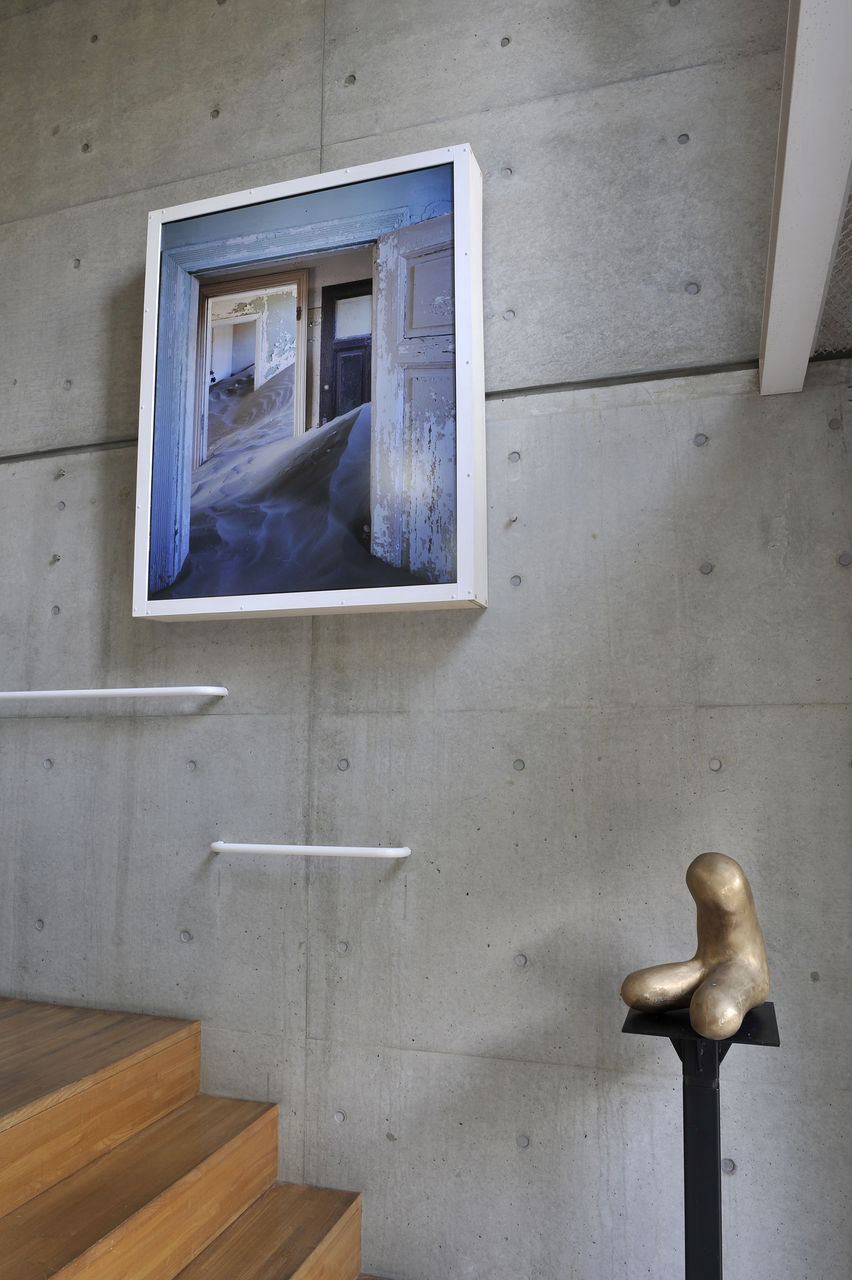 ドアを開けるとエントランスホール、右から北郷悟のテラコッタ、舟越直木のブロンズ、尾形一郎・優の大型写真作品
