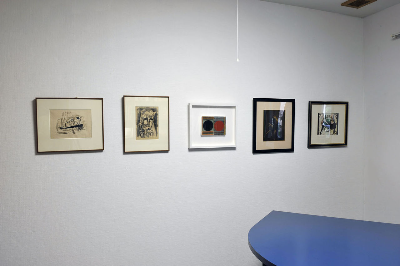 左から松本竣介(2点)、オノサト・トシノブ、そして瑛九のフォトデッサン2点。ブルーのテーブルに見覚えのある方は初代青山の一軒家時代からのお客様です。