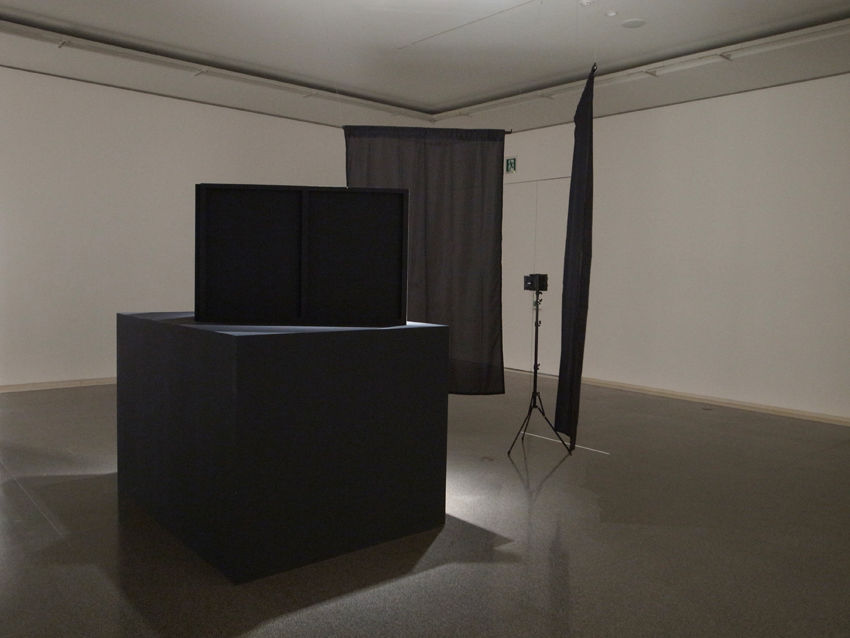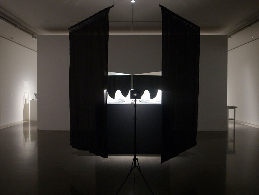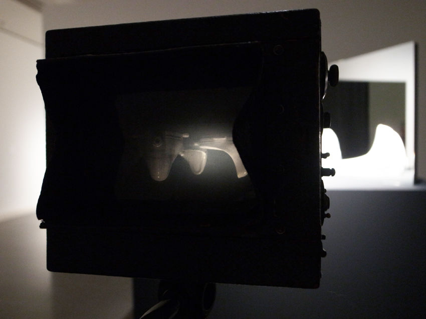 京都国立近代美術館4階奥の展示室「D」は中央の壁によって観客の素通りから展示を守っているようで、入り口の位置関係からか、わたしの場合は日本画などを観ながら右回りで入室する事が多い。今回は大きな箱と暗幕が張られた先にカメラが置かれた暗い部屋になっていて、見世物小屋の期待感が漂う。そして、カメラの背後に立つと鏡の世界が広がって思わず吸い込まれてしまった。視覚移動は奥から始まり手前のファインダーに繋がる仕掛。『泉』が背中越しに4つの表情を見せ、物質感を消して視覚だけに訴えかける様子。藤本さんは眼の位置を何処へ誘導しようとしているのだろう。ぼんやりとピントグラスに逆さの像が浮かび上がっている。