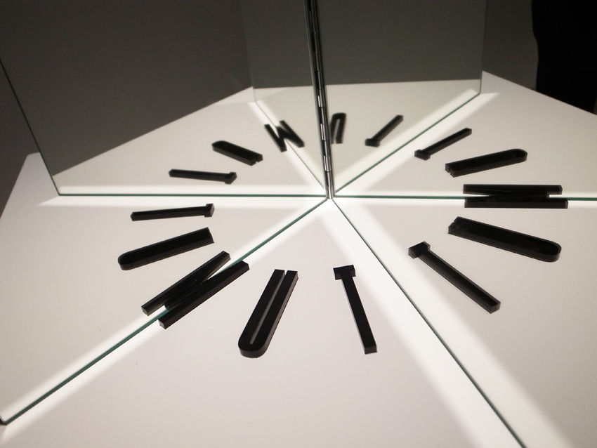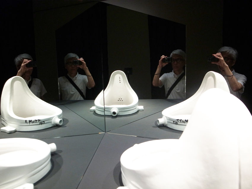 「左右は逆なのに上下はそのままに視える」鏡の不思議が鏡面との距離を反映した結果と知ったのは最近であるが、「普通の眼」しか持たない者にとって、この世界が四次元の影であるとしたら、合わせ鏡が投影する世界は光速の中にあり「影」を自明にする装置は時間と共にあるだろう。マン・レイは運動を色彩によって現そうとしたが、デュシャンは分割写真の並置による残像で解決しようとした。『階段を降りる裸体 No.2』(1912年)の後に現れた便器についての解釈は、さまざまあるが、時間の問題を取り込み、便器の後ろ姿の「カッコ良さ」に着目した藤本さんが、レンズを挟んで像の上下を逆にし、イメージが飛び去るのを防いでいるように思えた。ルーペを使ってピント面を確認したいところだけど美術館の展示室では許されないね----次回はギャラリースコープを持参しなくちゃ。