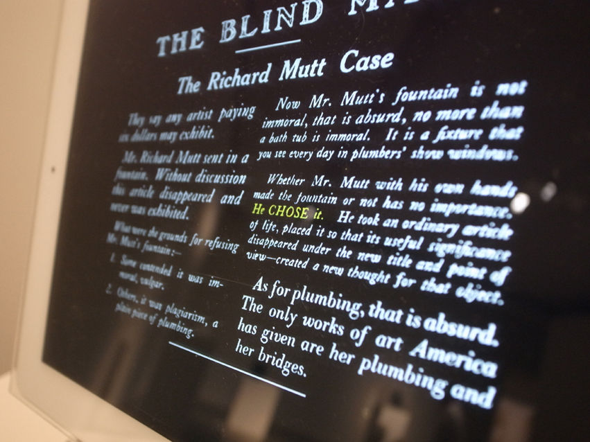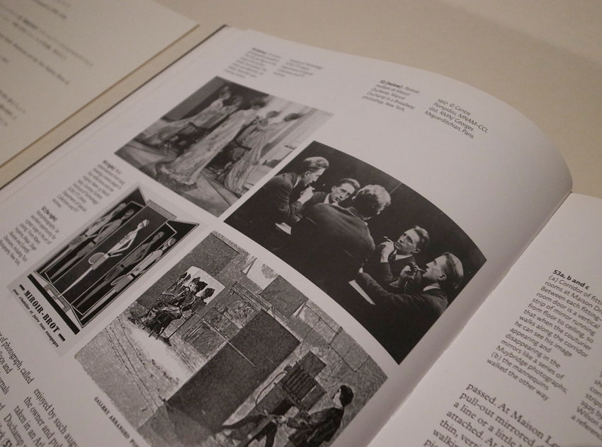 暗い部屋の入り口付近に置かれた研究書の頁では、デュシャンが写る20世紀初頭に流行した合わせ鏡による肖像写真が紹介されている。便器を持ち込んだ同じ年の秋、ブロードウェイの写真館で撮らせたと云う。