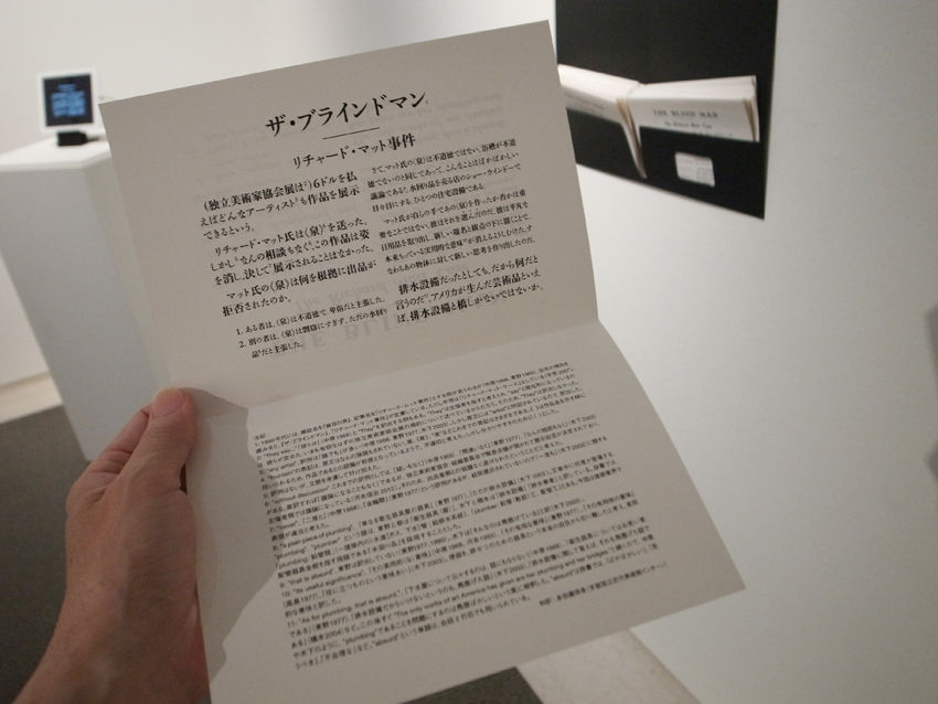 6月23日(金)の夕方、美術館1階講堂で藤本由紀夫さんの講演会が開かれた。各座席に『ザ・ブラインドマン』のコピーが置かれているので、驚き、今回の年間企画に対する関係者の熱意に恐れ入った。資料コピーの扱いじゃなくて、全16頁の冊子仕様。聴講者が溢れている。展覧会タイトルの「彼はそれを選んだのだ。」の「彼」はご自身の訳だから、話題は興味深い。デュシャンの発言から「作品を見る者にも、作品をつくる者と同じだけの重要性をあたえるのです。」や「芸術は選ぶことになる。」などを紹介しながら、友人から土産品として貰ったデュシャン展(メニル・コレクション、1987年)のカタログの裏面に飾られた「便器の後ろ姿」の美しさに気づいた体験を語られ、効果確認の為の紙製便器が肉付きされ、しだいに、デュシャンに成りきる作家の日常が面白い。合わせ鏡に便器を鎮座させるアイデアでの展示は、『泉』100年を祝福する世界中のどこかの美術館で採用される恐れがあるので、5期に別れた年間企画の早いタイミングでの展示をお願いしたと藤本さんは告白されていた。尚、前回の平芳幸治氏と同様、講演の内容は後日、文字起こしされると聞いた。紙モノが、どんどん生み出される展覧会、これは、すごい、そして、嬉しい。