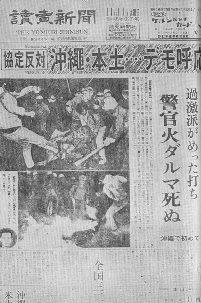 この年中平さんの映像観を揺さぶる事件が起きる。「沖縄ゼネスト警察官殺害事件」と呼ばれるもので、11月10日沖縄返還協定批准阻止を訴える全島ゼネストのさなか、警察官が死亡。翌日読売新聞に載った2枚の写真を証拠に、松永青年が殺人罪で逮捕・起訴された事件である。写真のキャプションでは青年が火だるまになった警察官をめった打ちにしたとしているが、そこに居合わせた人たちは青年が警察官を救い出そうとしていたと証言。つまり同じ写真に全く異なる解釈が成立するということであり、写真の〈記録〉性に疑問を抱かせることになる(「記録という幻影 ドキュメントからモニュメントへ」)。