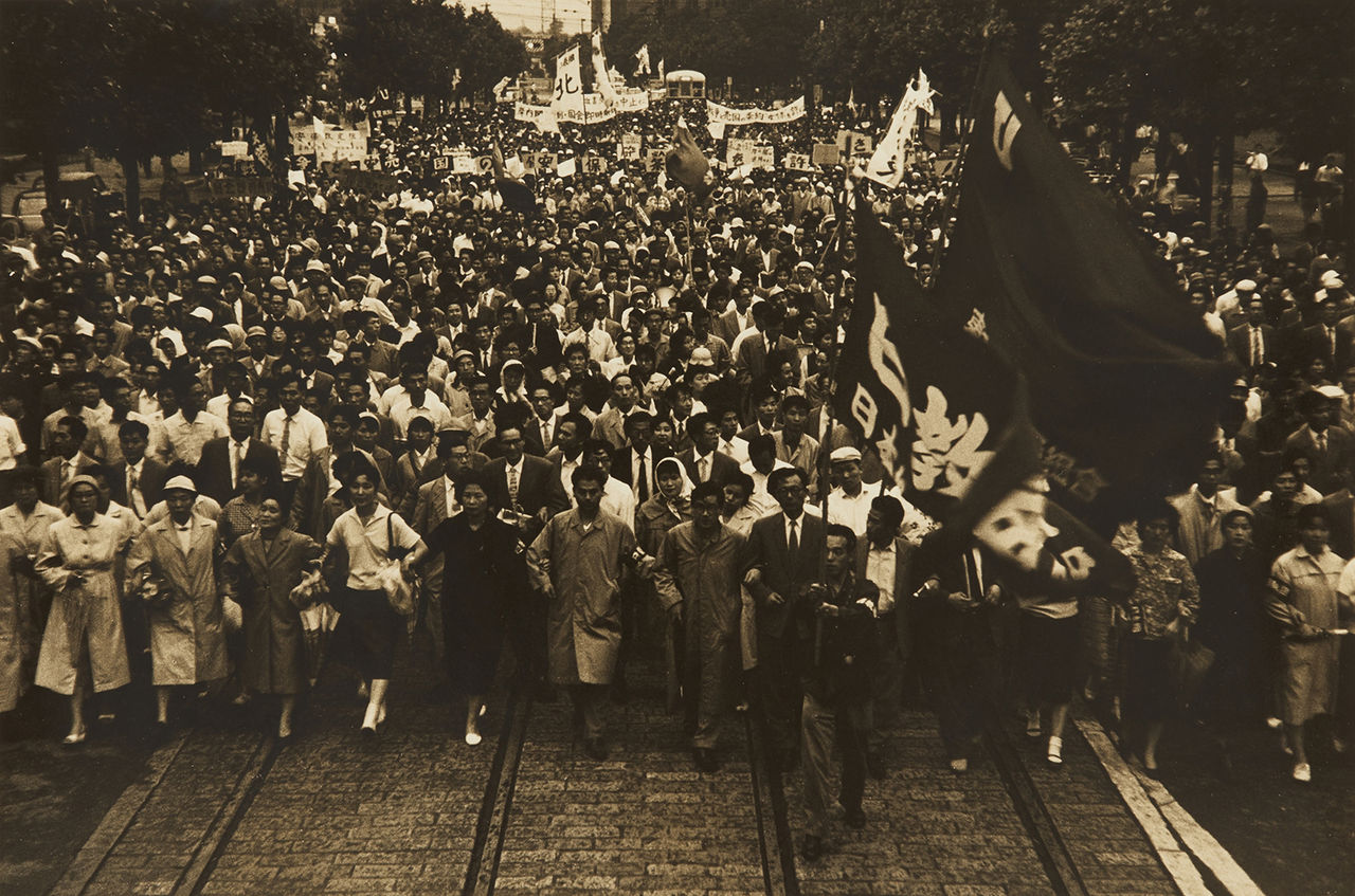道路には敷石がしかれ、都電の線路が通っていて、はるか後方には、身動きのとれなくなった車輛の頭も見える。前進する人の波が都電を押しとどめたのだ。その前進が、なによりも人の足によってなされたことを、この写真は強く訴えかけており、そこに溌剌した希望が感じられる。